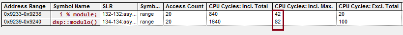 Вывод: реализация модулярной арифметики будет занимать 42 процессорных такта. Про смысл значений в таблице можно почитать тут. Означают они то, что профилируемый участок кода выполнялся 7 раз, на это ушло в итоге 294 такта, на одно выполнение профилируемой области максимально тратится 42 такта. На выполнение той же области, но исключая время, затраченное на подпрограммы, ушло 7 тактов, т.к. asm команда FFC - это команда вызова функции (вызывает какую-то встроенную, ассемблерную функцию).